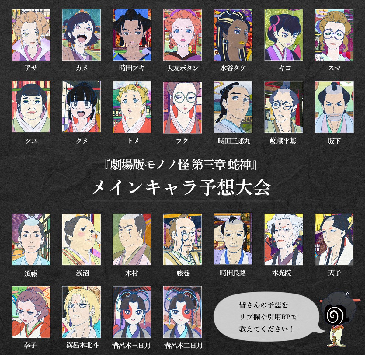 @anime_mononoke◤◢◤◢◤◢◤◢◤◢◤◢◤◢◤◢◤◢ 最終章のメインキャラクターは誰⁉️ ◤◢◤◢◤◢◤◢◤◢◤◢◤◢◤◢◤◢ 『#劇場版モノノ怪 第三章 蛇神』予想大会🎯 次のエピソードメインキャラクターは誰でしょう? ↓↓↓リプ欄や引用RPで皆様の予想を教えてください✨ pic.x.com/1lgoEKH1N7
