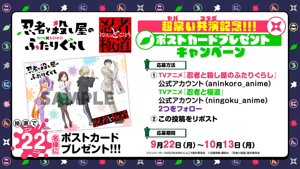 @YASHA13891085◤🍃*・°超常(ヤバ)いコラボキャンペーン*・°🔪◢ 『#忍者と殺し屋のふたりぐらし』 × 『#忍者と極道』 共演(コラボ)記念のポストカード プレゼント🎁有難うございます㊗️🎊ヽ(´エ`)ノ👏 ご縁を頂いて貴重な逸品を家宝にお迎えしたいです🤗 10/13(月)〆切⬇️☑🎶📢 x.com/ningoku_anime/…
