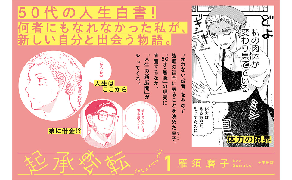 雁須磨子「起承転転」1巻、何者にもなれなかった自分と向き合う50歳地元Uターン女性 …雁須磨子「起承転転」1巻が、本日9月29日に太田出版から発売された。 「起承転転」は、18歳から続けてきた役者の仕事を50歳にして引退することを決意… (出典:コミックナタリー) |