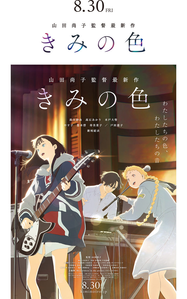 『きみの色』(きみのいろ、英 : THE COLORS WITHIN)は、2024年8月30日公開の日本のアニメーション映画。監督は山田尚子、脚本は吉田玲子、アニメーション制作はサイエンスSARU、企画・プロデュースはSTORY inc.が手掛ける。また、IMAXでの上映も実施された。…