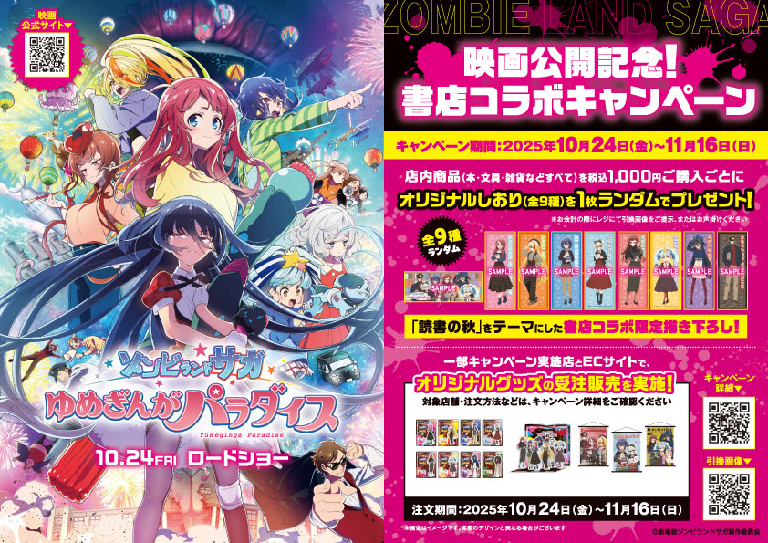 @honhikidashi🚀劇場版『ゾンビランドサガ ゆめぎんがパラダイス』公開& #ゾンビランドサガ書店コラボ まであと1日!🚀 明日はいよいよ劇場版『ゾンビランドサガ ゆめぎんがパラダイス』の公開日✨ 映画館へお出かけの際は、ぜひコラボ書店にもお立ち寄りください! pic.x.com/Sg2iLTf4hE