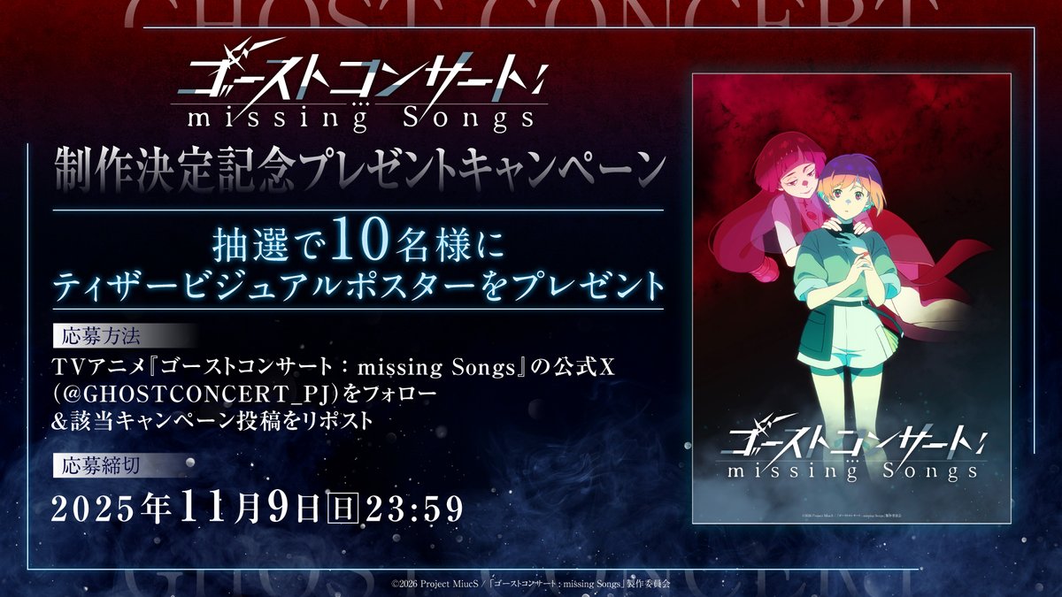 @aniverse_brsTVアニメ『ゴーストコンサート: missing Songs』 2026年放送決定! ティザービジュアル・ティザーPVが公開! メインスタッフ&キャスト決定! aniverse-mag.com/archives/341885 #藤寺美徳 #日高里菜 #GHOSTCONCERT #ゴーストコンサート pic.x.com/COCm3ZHsiV