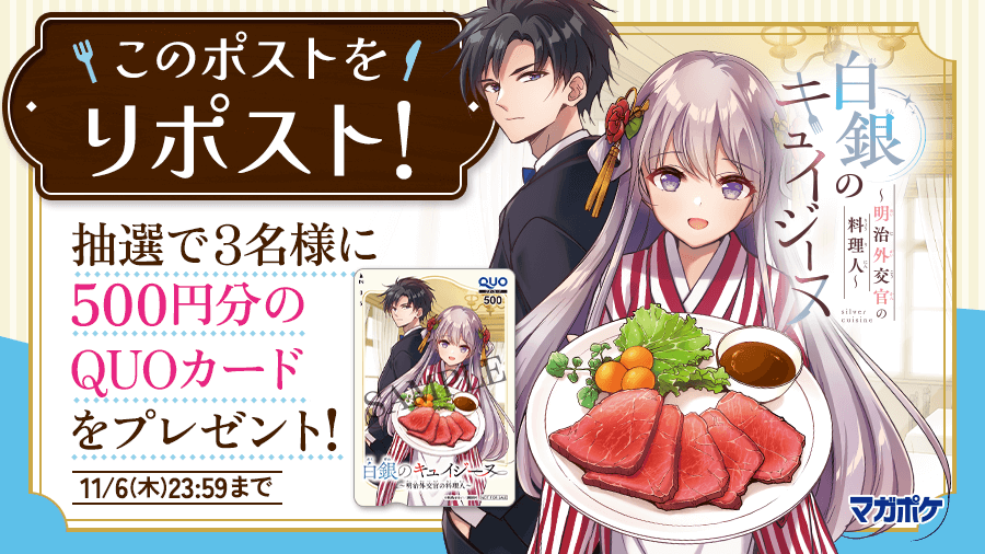 @magapoke\📕単行本第1⃣巻発売記念!!🎉/ 『 白銀のキュイジーヌ~明治外交官の料理人~ 』 🔃リポストキャンペーン始まりました!! (~11/6) この機会にぜひご一読ください!👇😊📖✨ ➡️s.magazinepocket.com/ldg?t=2846 🎁応募はRP用ポストをリポストしてね!!😉 #白銀のキュイジーヌ x.com/magapoke/statu…