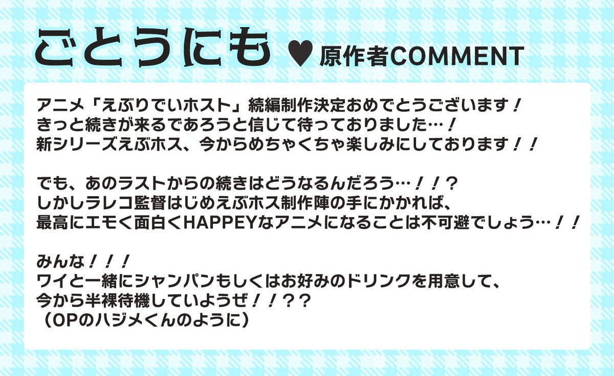 @emiempeimuえぶりでいホスト続編制作決定大感謝!!"HAPPEY"不可避!!!ヤッピィィイイイイィ!!!🎉㊗️ 原作も読み始めたからどこアニメ化するかワクワクしながら読むぜぇ!楽しみ本当にありがとう😭 x.com/ebuhosu_anime/…