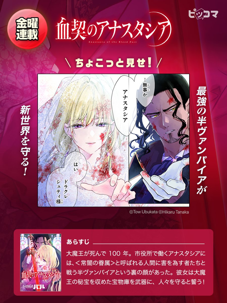 @ubukata_summit🦇今日から連載開始!🌙 市役所で働くアナスタシアには、 人間に害を為す者たちと戦う半ヴァンパイアという別の顔があった。 彼女は大魔王の秘宝を収めた<至宝庫>を武器に、 人々を守ると誓う! 『血契のアナスタシア』 原作:冲方丁(@ubukata_summit) 漫画:田中ひかる(@c10wn23) pic.x.com/GfAeN2g6ps