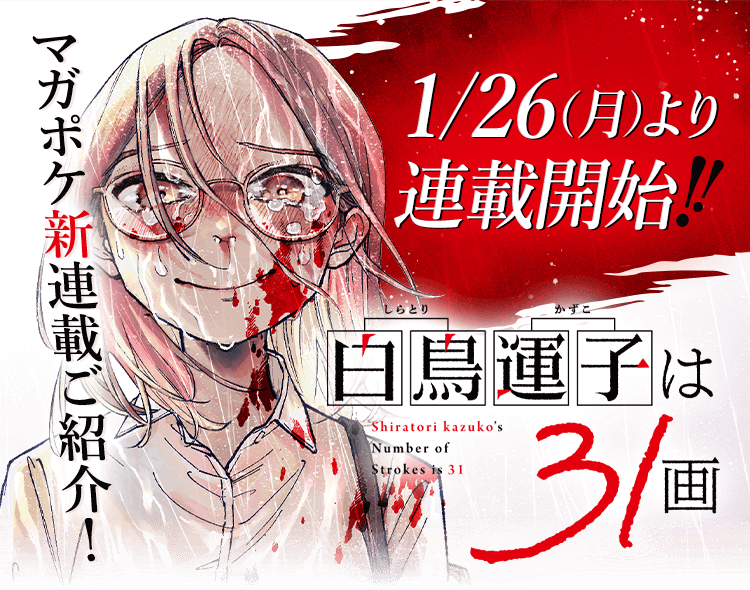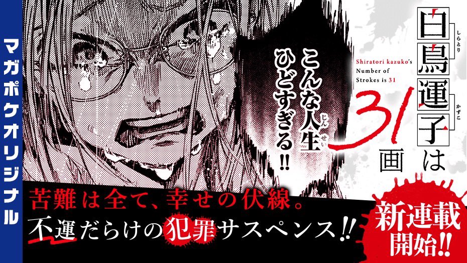@magapoke/ 📢 新連載告知! \ 1/26(月)より新連載スタート!!✨ 『 白鳥運子は31画 』 原作 松明明利 @taimatsuakari 作画 ますやまある @0130_masu 不運だらけの犯罪サスペンス! 👉詳しくは #マガポケ アプリでチェック!! #白鳥運子は31画 #しらとりかずこは31かく pic.x.com/kcFgG16xnD