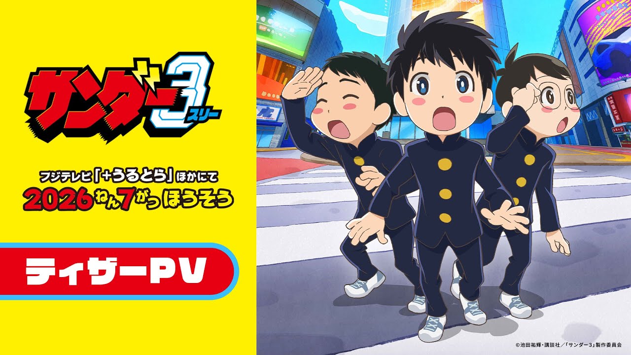 『サンダー3』アニメ化決定!“スモール3”役に鈴代紗弓、川井田夏海、秋山絵理、ふたば役に蜜蜂ほのか ティザーPVも公開 池田祐輝による人気漫画『サンダー3』がアニメ化され、2026年7月からフジテレビ「+Ultra」で放送されることが決定。ティザービジュアル&PVが公開された。 (出典:TV LIFE web) |