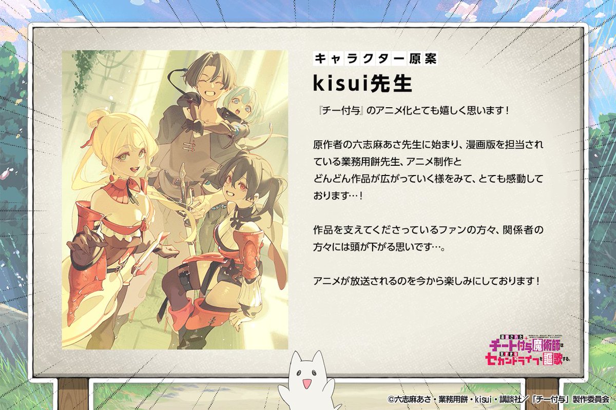 「チート付与魔術師」P.A.WORKS制作でTVアニメ化決定!カオスな世界観で話題♪「月マガ基地」連載ファンタジー …ファンから絶大な人気を集める『チー付与』のTVアニメに注目だ。 以下、コメント全文掲載 六志麻あさ 『チー付与』アニメ化、とても嬉しいです。 業務用餅… (出典:アニメ!アニメ!) |