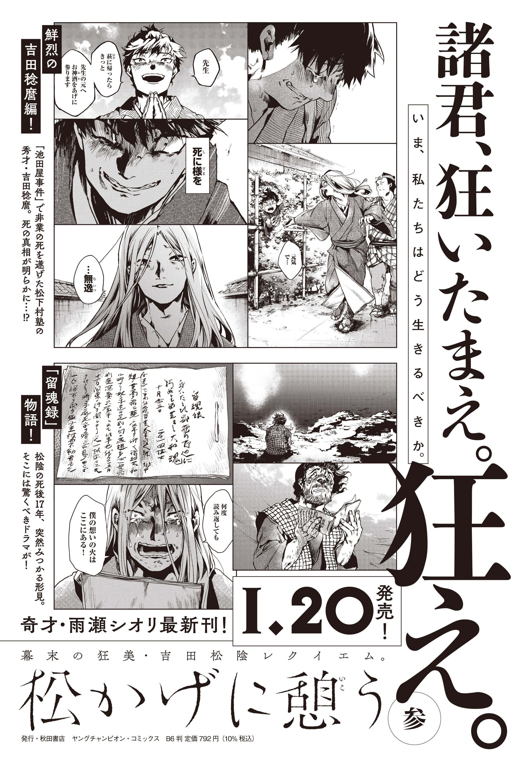 @Betterthanraw98今週は雨瀬シオリ先生の吉田松陰レクイエム漫画「松かげに憩う」の第6巻が発売されるので楽しみです😊(ちなみに第5巻からの続きで高杉さんのエピソードが描かれます)